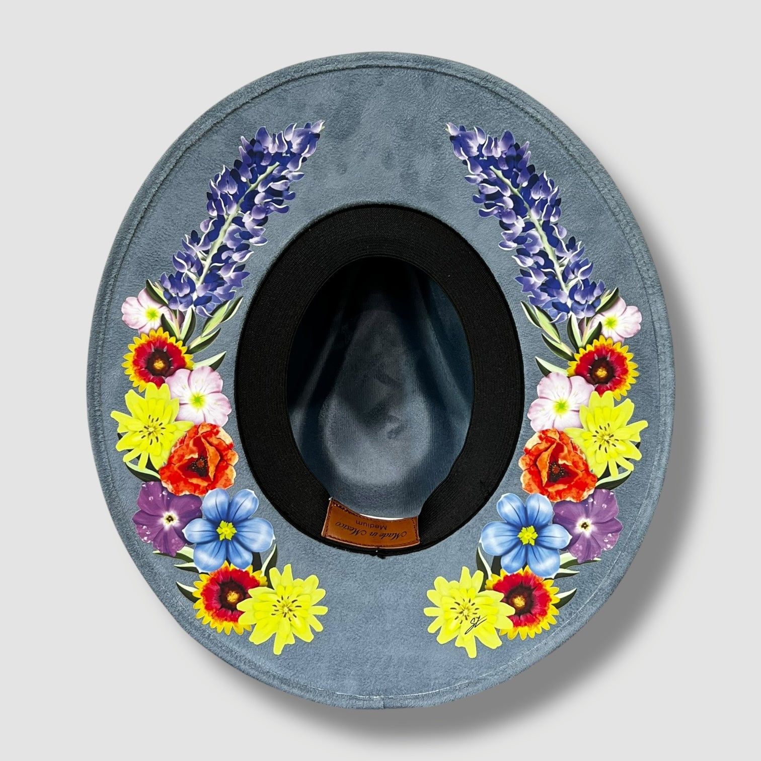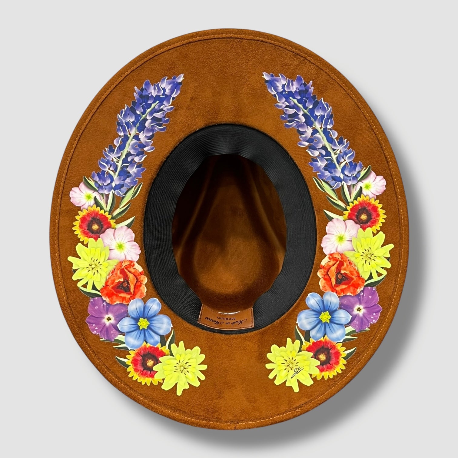This wide brim hat bursts with color and life, transforming the underside into a floral masterpiece. Blooms climb upward in mirrored arrangements, with vibrant bluebonnets anchoring the top and a cascade of colorful flowers reds, yellows, purples, and blues framing the crown. The layered arrangement creates a lush, garden-like effect that feels bold, festive, and full of Southern charm. Rather than painting directly onto the hat, we use a specialized method to apply the artwork in a way that preserves every rich detail and keeps the colors vivid and beautiful over time. The result is a hat that’s not only eye catching, but made to last.