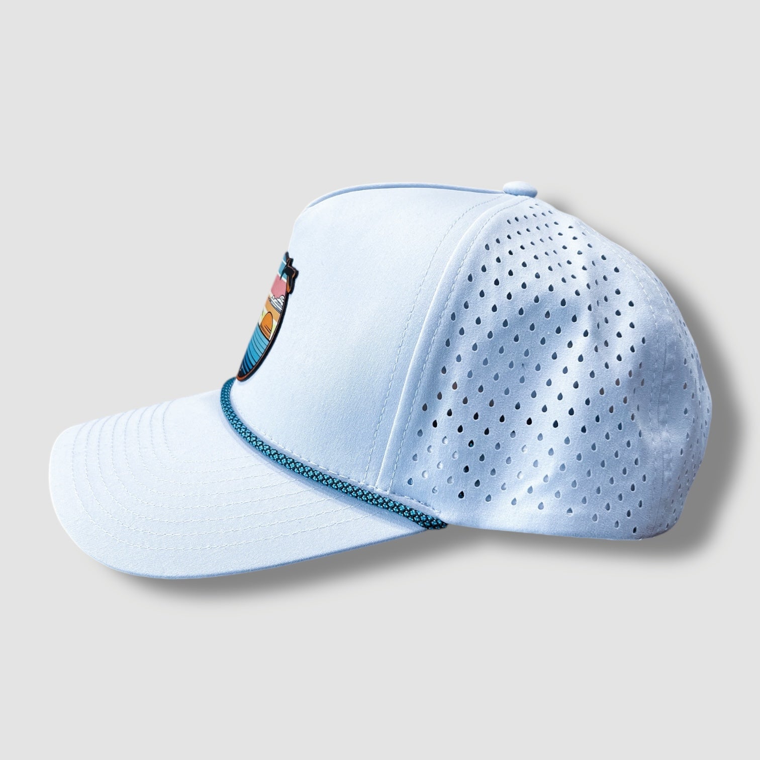 Sky blue performance trucker hat featuring a bold Egret sunset patch with cattails, and a beautiful swampy sunset. Lightweight design with perforated sides and retro rope detail for comfort and style.