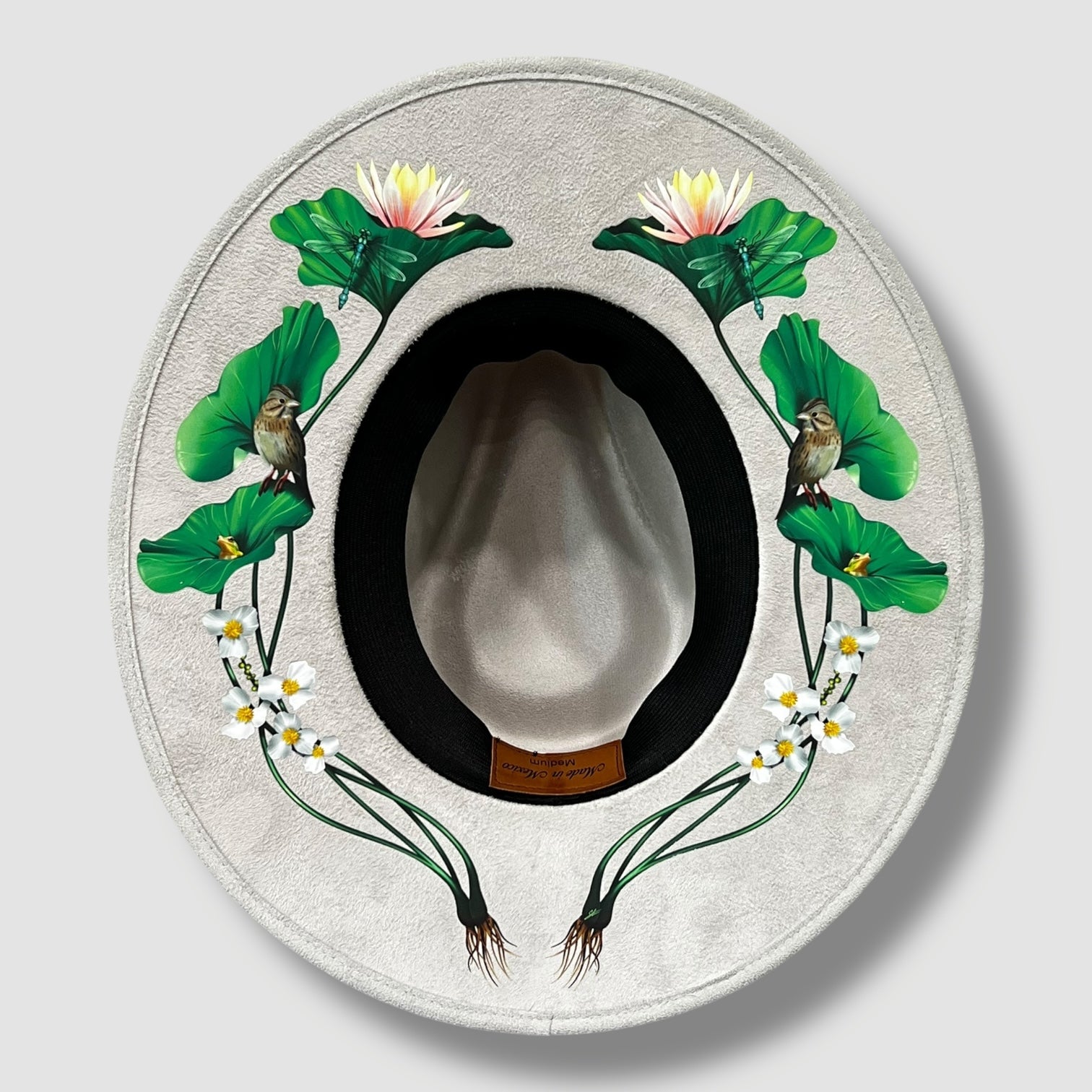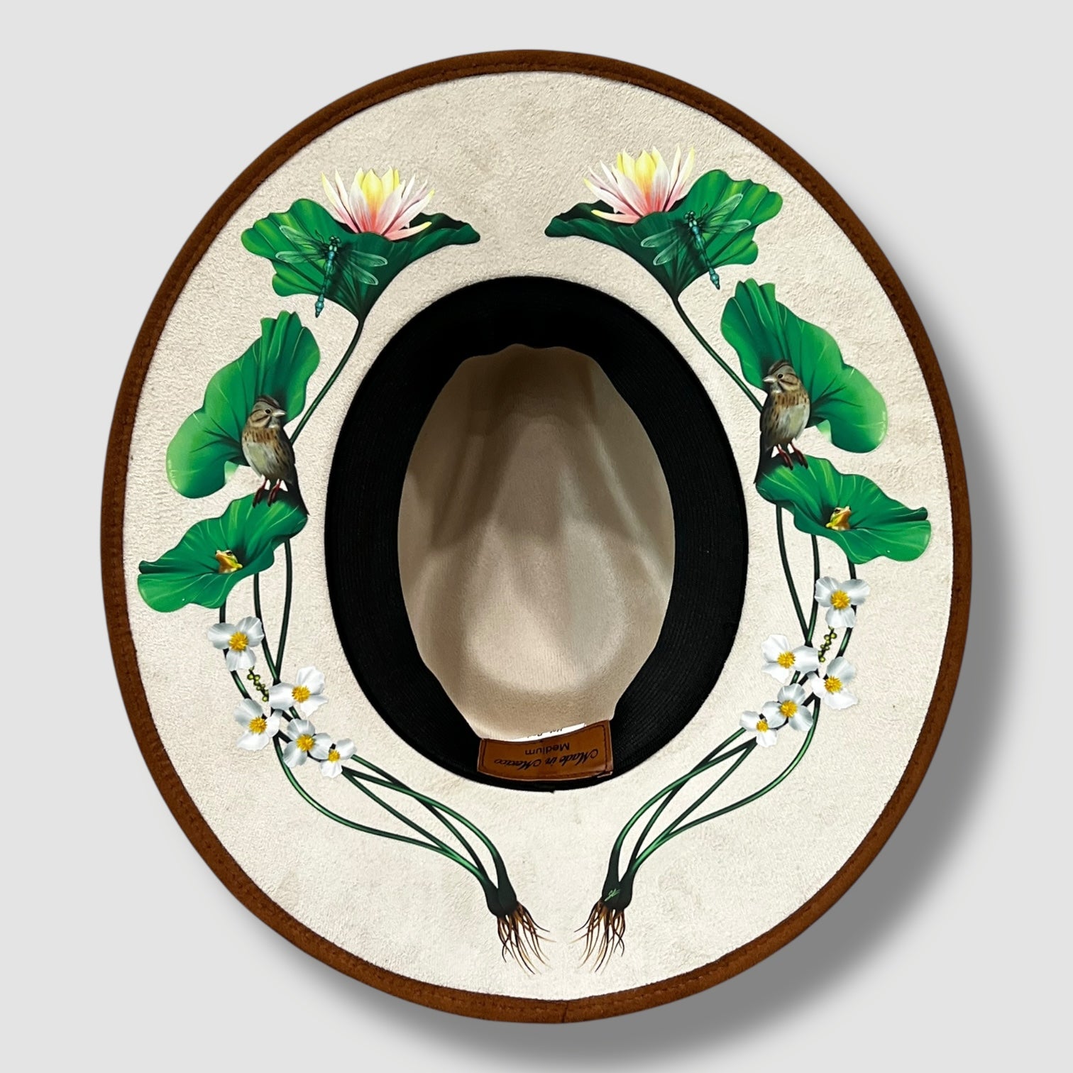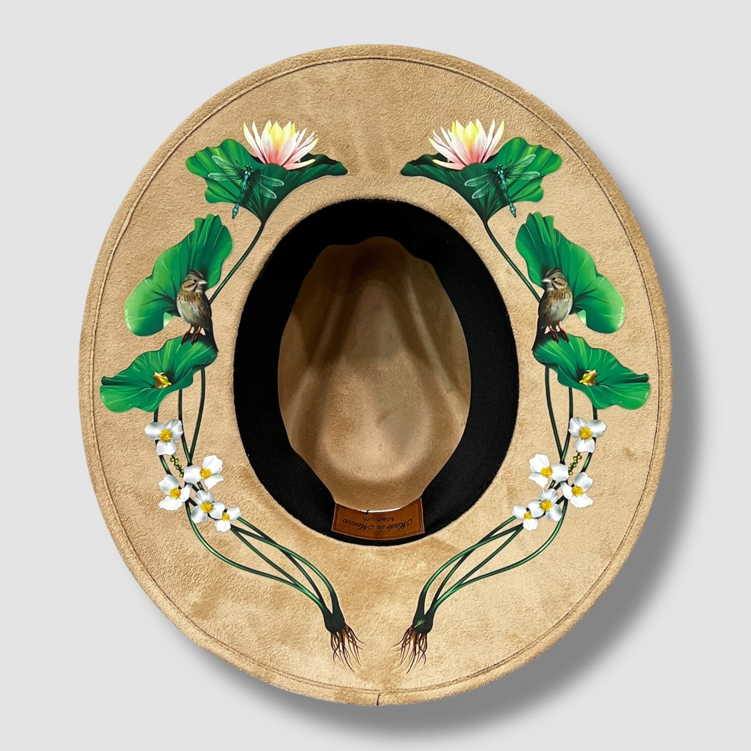 This tan wide brim hat transforms into a serene Louisiana waterscape with its artwork. The underside brim features lush green lily pads stretching outward, topped with blooming pink lotus flowers where dragonflies perch. Nestled among the leaves are small songbirds, adding life and movement to the scene. Flowing from the bottom, delicate white blossoms trail with visible roots, creating the impression that the hat itself is growing from the bayou.