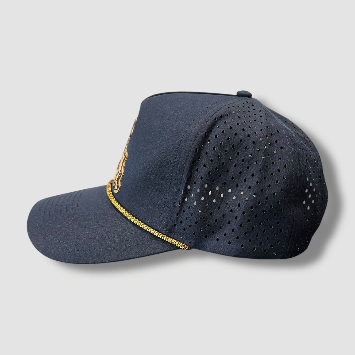 Show your Louisiana pride with this navy performance trucker hat, featuring a bold state outline patch crafted from rich cherry wood veneer and backed with gold leather for a striking contrast. The design showcases a cypress tree and sunset scene, tying together the beauty of the bayou with handcrafted detail. Finished with perforated side panels and a gold rope accent, it’s built for comfort, style, and Southern heritage.